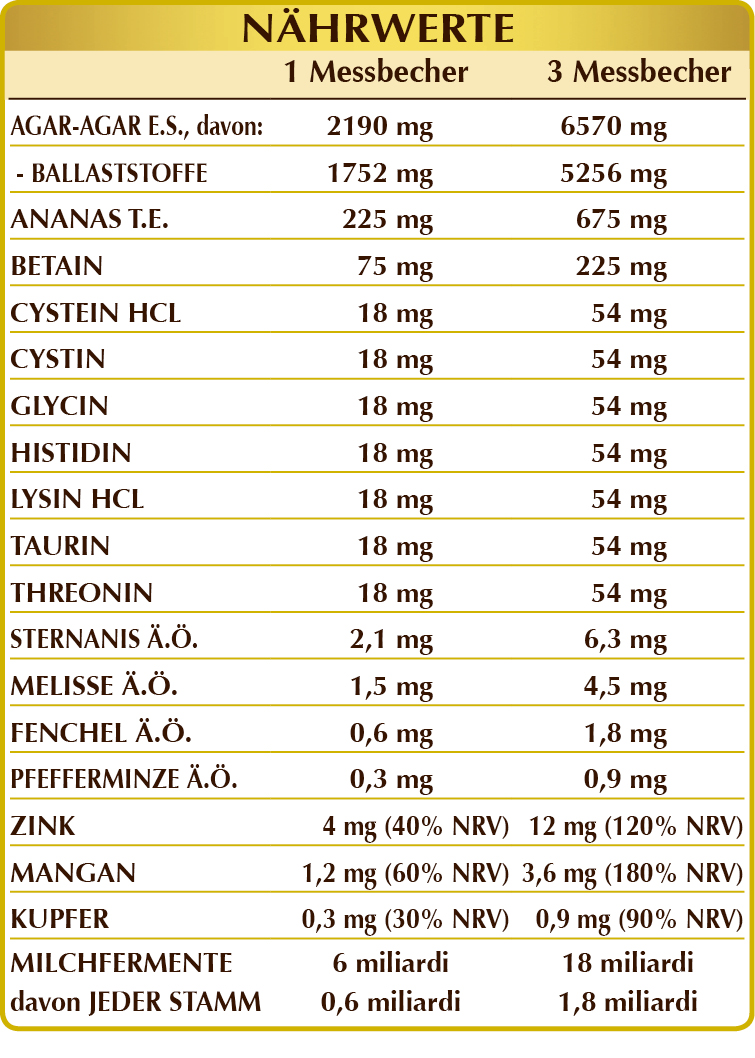 Agar (Gelidium amansii) Thallus (Alge) T.E., Maltodextrine aus Mais oder Reis, Ananas (Ananas comosus) Fruchtstiele T.E. (Bromelain 2500 GDU/g), Betainchlorhydrat, lebende Milchfermente-Mischung (standardisiert auf 10% jeder der folgenden Stämme: Bifidobacterium bifidum SD5215, breve SD5206, lactis SD5219; Lactobacillus acidophilus SD5212, brevis SD5214, bulgaricus SD5589, casei SD5213, paracasei SD5275, plantarum SD5209, rhamnosus SD5217), Zinkgluconat, (L-)Cystein HCL oder Hydrochlorid, (L-)Cystin, Glycin, (L-)Histidin, (L-)Lysin HCL oder Hydrochlorid, Taurin, (L-)Threonin, Mangangluconat, Kupfergluconat, Sternanis (Illicium verum) Früchte Ä.Ö., Melisse (Melissa officinalis) Blätter Ä.Ö.; Süßstoffe Natürlicher Herkunft: Steviol-Glykoside (E960) und Thaumatin(E957); Fenchel (Foeniculum vulgare) Früchte Ä.Ö., Pfefferminze (Mentha piperita) Blätter Ä.Ö.