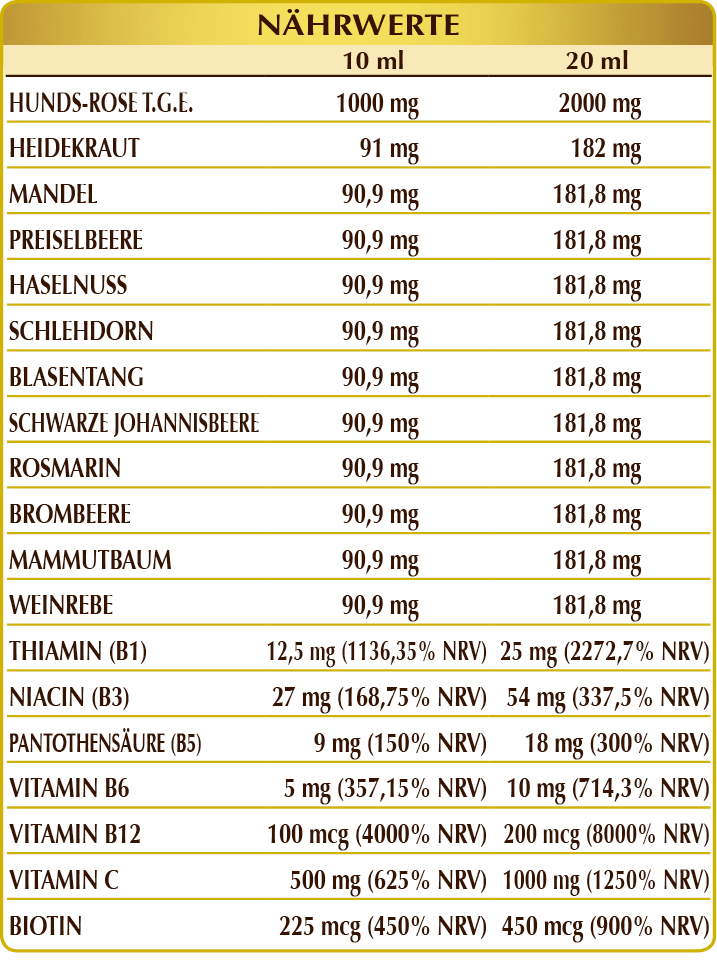 Nahrungsergänzungsmittel auf Basis von Glyzerinmazerat von frischem meristematischem Gewebe mit einem hohen Gehalt an Vitaminen, die alle zum normalen Energiestoffwechsel beitragen. Insbesondere fördern die Vitamine B6, B12 und C die normale Funktion des Immunsystems und reduzieren gemeinsam mit den Vitaminen B3 und B5 Müdigkeit und Erschöpfung. Die Vitamine B1, B3, B6, B12 und Biotin unterstützen die Funktionalität des Nervensystems, und erhalten die normale psychologische Funktion. Außerdem trägt Biotin zur Erhaltung der Haargesundheit bei, während Vitamin C die Zellen vor oxidativem Stress schützt und die Bildung von Kollagen fördert, um die normalen Funktionen von Blutgefäßen, Knochen, Knorpel, Haut, Zähnen und Zahnfleisch aufrechtzuerhalten.