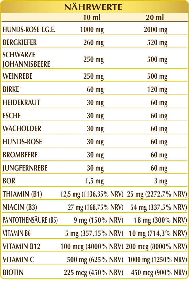 Nahrungsergänzungsmittel auf Basis von Glyzerinmazerat von frischem meristematischem Gewebe mit einem hohen Gehalt an Vitaminen, die alle zum normalen Energiestoffwechsel beitragen. Insbesondere fördern die Vitamine B6, B12 und C die normale Funktion des Immunsystems und reduzieren gemeinsam mit den Vitaminen B3 und B5 Müdigkeit und Erschöpfung. Vitamin C schützt die Zellen vor oxidativem Stress und fördert die Bildung von Kollagen, wodurch die normalen Funktionen von Knorpel, Blutgefäßen, Knochen, Haut, Zähnen und Zahnfleisch unterstützt werden. Außerdem trägt Biotin zur Erhaltung der Haargesundheit bei.