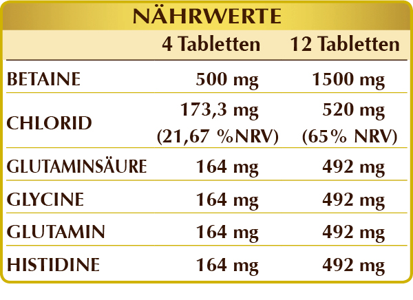 Chlorid-Nahrungsergänzungsmittel, angereichert mit Betainhydrochlorid und anderen Nährstoffen. Chlorid fördert die Verdauungsfunktion durch die normale Produktion von Salzsäure im Magen, während Betain zum normalen Metabolismus von Homocystein* beiträgt.