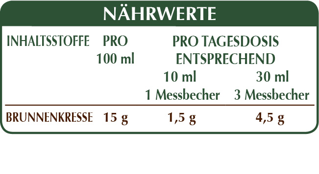 Alkoholfreie Flüssig Gesamt-Extrakt, gewonnen aus: bidestilliertes pflanzliches Glycerin, reinem Wasser, Brunnenkresse (Nasturtium officinale) Kraut.