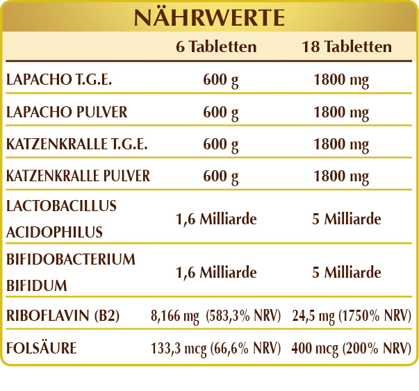 Lapacho oder Pau d'arco (Tecoma curialis oder Tabebuia avellanedae) Rindenpulver und T.G.E, Katzenkralle (Uncaria tomentosa) Rindenpulver und T.G.E., mikrokristalline Zellulose°, Arabisches Gummi°, Siliciumdioxid°°, Milchsäurebakterien (Lactobacillus acidophilus SGL11 und Bifidobacterium bifidum SGB0), pflanzliches Magnesiumstearat°°, aktiviertes Vitamin B2 (Riboflavin-5-phosphat-Natrium) und aktivierte Folsäure (L-Methylfolat-Calcium).
