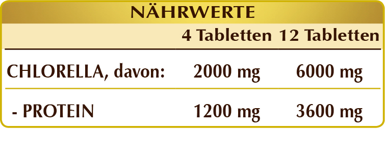 Nahrungsergänzungsmittel auf Basis von Chlorella, einer besonders proteinreichen Alge, die antioxidative Eigenschaften besitzt, die natürlichen Abwehrkräfte des Körpers fördert und die regelmäßigen Entschlackungsfunktionen unterstützt.