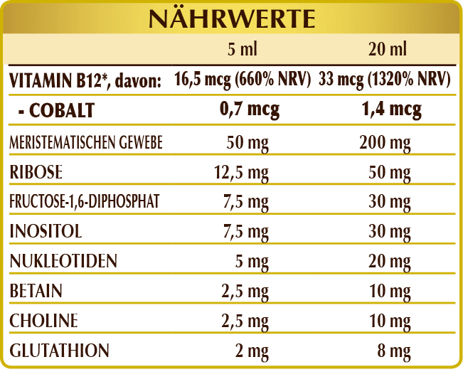 *Cyanocobalamin enthält Kobalt in organischer Form. NRV= Nutrient Reference Value