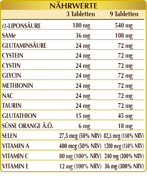 α-Liponsäure, fettlösliches Vitamin C (Ascorbylpalmitat), mikrokristalline Cellulose°, Arabisches Gummi°, Siliziumdioxid°°, SAMe (S-Adenosylmethionin Disulfattosylat), pflanzliches Vitamin E (D-α-Tocopherylacetat), (L-) Glutaminsäure, (L-) Cystein-HCL oder Hydrochlorid, (L-) Cystin, Glycin, (L-) Methionin, NAC (N-Acetylcystein), Taurin, reduziertes Glutathion, Süßorange (Citrus aurantium var. sinensis oder dulcis) Fruchtschalen Ä.Ö., (L-)Selenomethionin, Vitamin A (Retinylacetat). °Füllstoff °°Trennmittel