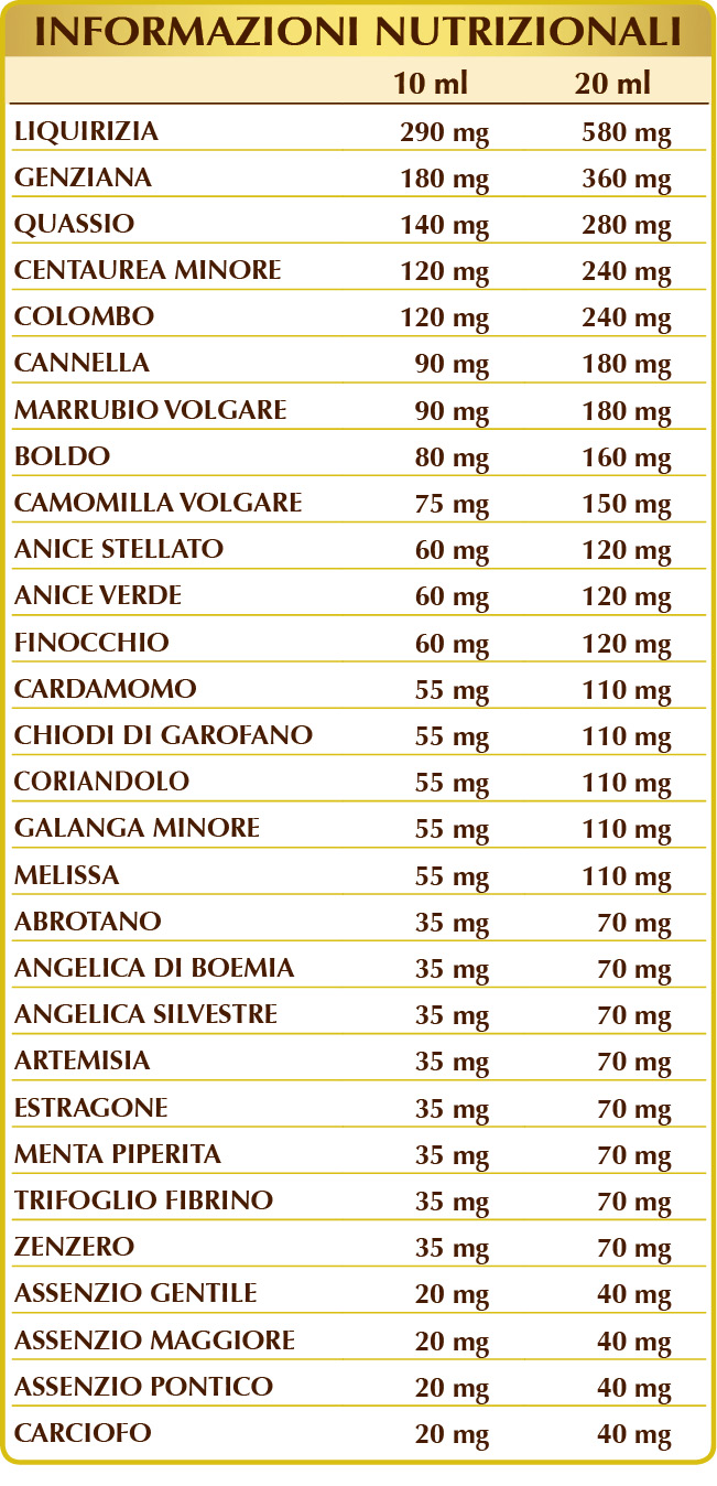 Reines Wasser, Lakritze (Glycyrrhiza glabra) Wurzeln F.G.E., Enzian (Gentiana lutea) Wurzeln F.G.E., Quassiabaum (Quassia amara) Holz F.G.E., Tausendgüldenkraut (Centaurium erythraea) Spitzen F.G.E., Kalumba (Jateorhiza palmata) Wurzeln F.G.E., Zimt (Cinnamomum zeylanicum) Rinde F.G.E., Andorn Kraut mit Blüten F.G.E., Boldo (Peumus boldus) Blätter F.G.E., echte Kamille (Matricaria chamomilla) Blütenköpfe F.G.E., Sternanis (Illicium verum) Früchte F.G.E., grüner Anis (Pimpinella anisum) Früchte F.G.E., Fenchel (Foeniculum vulgare) Früchte F.G.E., Kardamom (Elettaria cardamomum) Samen F.G.E., Gewürznelke (Eugenia caryophyllata) Blütenknospen F.G.E., Koriander (Coriandrum sativum) Früchte F.G.E., Kleiner Galgant (Alpinia officinarum) Rhizome F.G.E., Melisse (Melissa officinalis) Blätter F.G.E., Eberraute (Artemisia abrotanum) Spitzen F.G.E., Arznei-Engelwurz (Angelica archangelica) Wurzeln F.G.E., Wald-Engelwurz (Angelica sylvestris) Wurzeln F.G.E., Beifuß (Artemisia vulgaris) Kraut mit Blüten F.G.E., Estragon (Artemisia dracunculus) Blätter F.G.E., Pfefferminze (Mentha piperita) Blätter F.G.E., Fieberklee (Menyanthes trifoliata) Blätter F.G.E., Ingwer (Zingiber officinalis) Rhizome F.G.E., Römischer Wermut (Artemisia pontica) Kraut mit Blüten F.G.E., Wermut (Artemisia absinthium) Kraut mit Blüten F.G.E., Walliser Beifuß (Artemisia vallesiaca) Kraut mit Blüten F.G.E., Artischocke (Cynara scolymus) Blätter F.G.E.