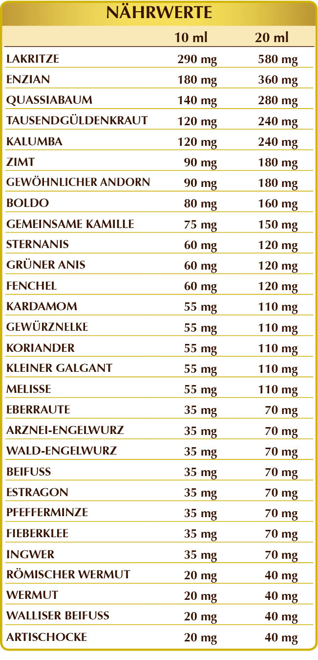 Nahrungsergänzungsmittel, das eine spezielle Mischung von 29 Kräutern enthält, die nützlich sind, um die Verdauungsfunktion zu unterstützen. Des Weiteren fördern Kalumba, Andorn, Zimt, Kamille, Sternanis, Grüner Anis, Fenchel, Kardamom, Gewürznelke, Koriander, Kleiner Galgant, Melisse, Beifuß, Arznei-Engelwurz, Wald-Engelwurz, Pfefferminze, Ingwer, Artischocke und Wermut die Beseitigung von Blähungen.