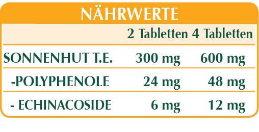 Echinacea (Echinacea angustifolia e purpurea) Wurzeln T.E. (Standardisiert auf 8% in Polyphenolen,davon2% Echinacosiden), Maltodextrine aus Mais oder Reis, mikrokristalline Cellulose°, Gummi Arabicum°, Siliciumdioxid°°, Magnesiumstearat pflanzlichen Ursprungs°°.