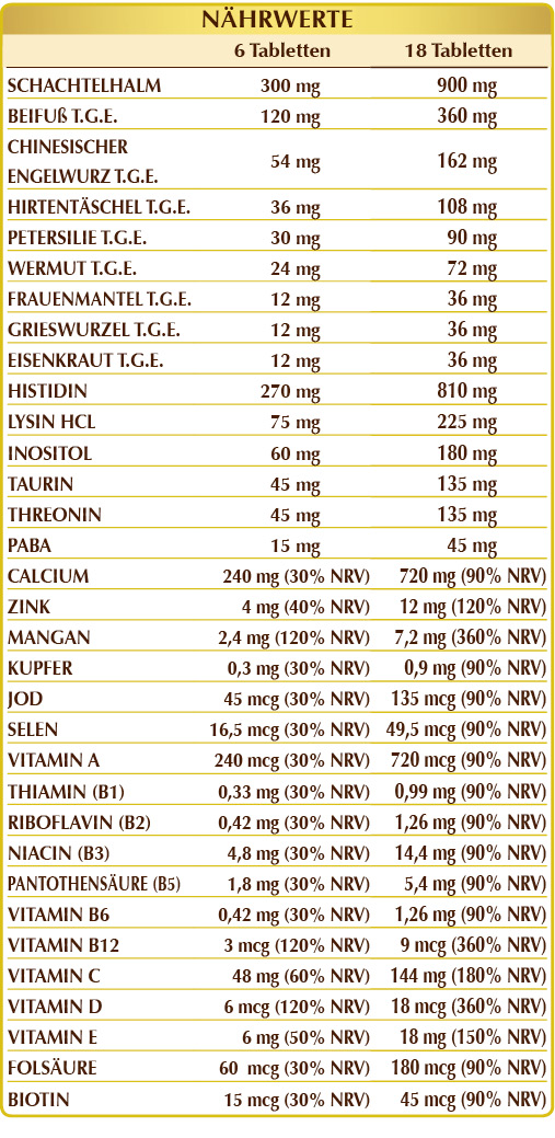 Wir empfehlen die Einnahme von 6 Tabletten ein- bis dreimal am Tag zu jeder Zeit (5 bis 18 Tabletten am Tag). Nach Gebrauch sorgfältig wieder schließen.