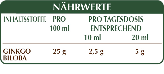 Alkoholfreie Flüssig Gesamt-Extrakt, gewonnen aus: bidestilliertes pflanzliches Glycerin, reinem Wasser, Ginkgo (Ginkgo biloba) Blätter.