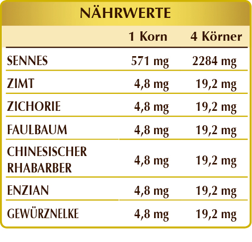 Sennes, Zichorie, Faulbaum und Rhabarber fördern die regelmäßige Darmpassage. Zimt, Nelken und Enzian tragen zur Beseitigung von Darmgasen bei und fördern die Verdauungsfunktion.