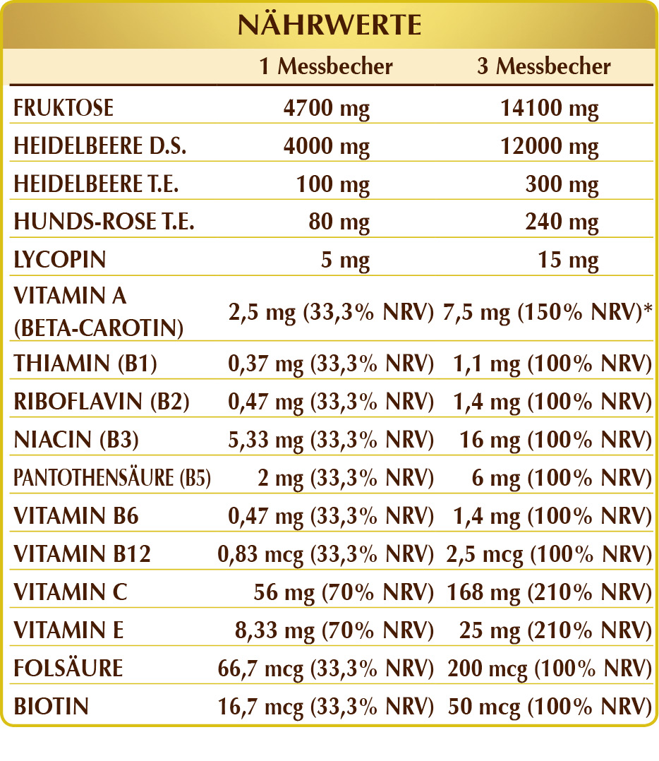 3 gestrichene Messbecher (30 g) enthalten durchschnittlich: 12 g dehydrierten Heidelbeer-Saft, was 50 g frischen Heidelbeeren entspricht. Um diese Packung herzustellen, sind etwa 600 g frische Heidelbeeren verwendet worden.