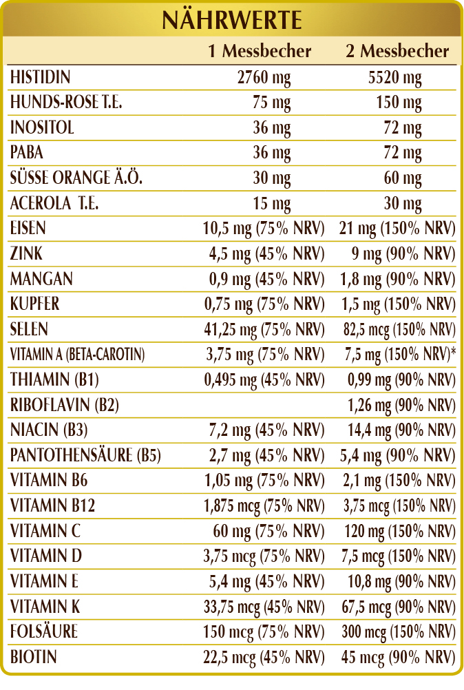 (L-)Histidin, Maltodextrine aus Mais oder Reis, Hunds-Rose (Rosa canina) Früchte T.E. (standardisiert auf 70% Vitamin C), Eisenammoniumcitrat, Karotte (Daucus carota) Wurzeln T.E. (standardisiert auf 10% Vitamin C), Pflanzliches Inositol (aus Maissamen gewonnen), PABA (p-Aminobenzoesäure), Zinkgluconat; natürliches Aroma: süße Orange (Citrus aurantium var. sinensis oder dulcis) Fruchtschalen Ä.Ö., Acerola (Malpighia glabra) Früchte T.E. (standardisiert auf 50% Vitamin C), Vitamin E (D-α-Tocopherylacetat); Süßstoffe natürlicher Herkunft: Steviolglykoside aus Stevia, Thaumatin; Mangangluconat, Vitamin B3 (Niacin), Kupfersulfat, Vitamin B5 (Calciumpantothenat), Vitamin B6 (Pyridoxinhydrochlorid), Vitamin K1 (Phyllochinon), Vitamin B1 (Thiaminhydrochlorid), Vitamin B2 (Riboflavin), Folsäure, Natriumselenit, Biotin, Vitamin D3 (Cholecalciferol), Vitamin B12 (Cyanocobalamin).