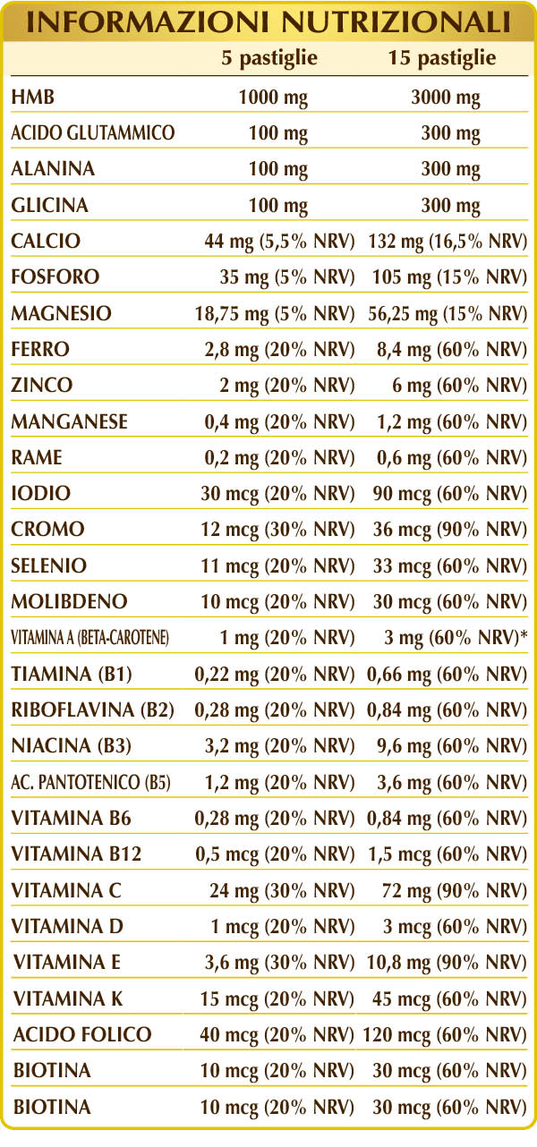 HMB (Calciumhydroxymethylbutyrat), mikrokristalline Cellulose°, Gummi arabicum°, Calciumhydrogenphosphat, (L-)Glutaminsäure, (L-)Alanin, Glycin, Magnesiumoxid, Siliciumdioxid°°, Eisengluconat, Vitamin C (L-Ascorbinsäure), Zinkgluconat, pflanzliches Magnesiumstearat°°, Beta-Carotin aus Karottenwurzeln (titriert mit 10 %), pflanzliches Vitamin E (D-α-Tocopherylacetat), Vitamin B3 (Inositolhexanicotinat), Mangangluconat, Kupfergluconat, Vitamin B5 (Calciumpantothenat), aktiviertes Vitamin B2 (Natrium-Riboflavin-5-Phosphat), aktiviertes Vitamin B6 (Pyridoxal-5-Phosphat), Flechte (Cladonia rangiferina) Thallus T.E. (titriert mit Vitamin D3 Cholecalciferol 100.000 IE/g), Vitamin B1 (Thiaminhydrochlorid), Chrompicolinat, aktivierte Folsäure (Calcium-L-Methylfolat), Kaliumiodid, Natriumselenit, Natriummolybdat, Vitamin K1 (Phyllochinon), Biotin, aktiviertes Vitamin B12 (5-Desoxyadenosylcobalamin, Methylcobalamin). T.E.= Trockenextrakt °Füllstoff °°Trennmittel