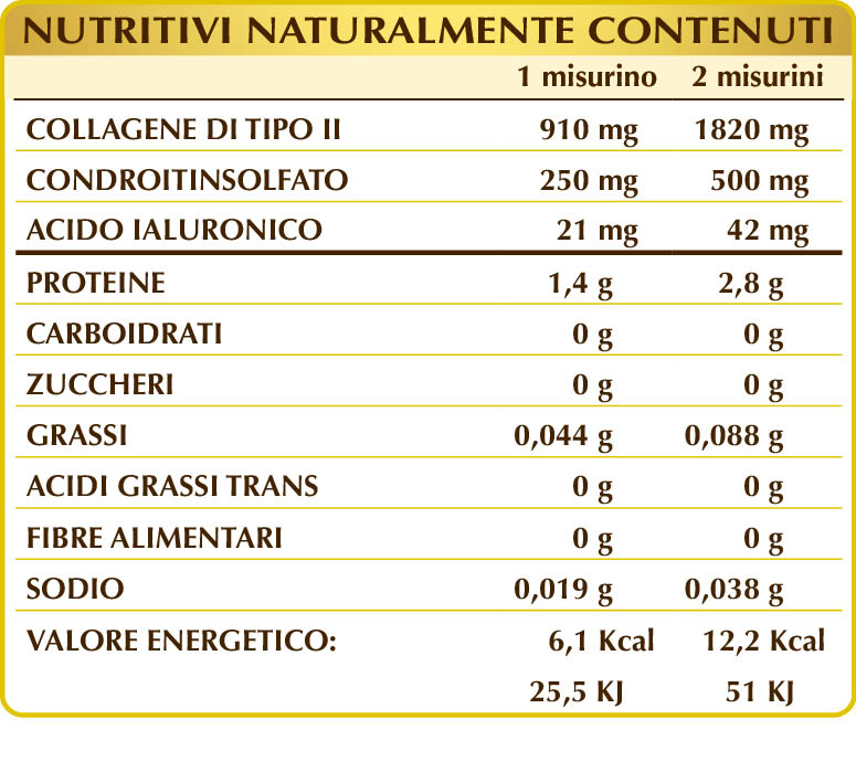 Typ-II-Kollagen aus hydrolysiertem Hühnerknorpelpulver (52%), Maltodextrin aus Mais oder Reis.