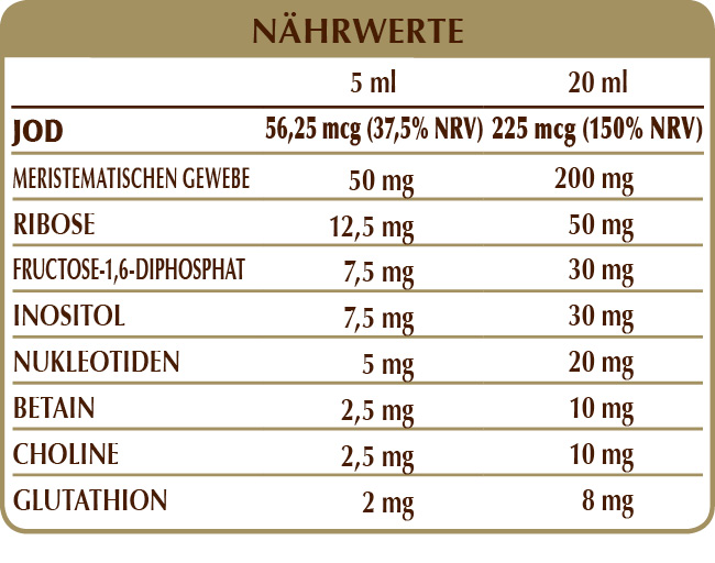 Bidestilliertes pflanzliches Glycerin, reines Wasser; Frische Meristemgewebe: Himbeere (Rubus idaeus) junge Triebe, Walnuss (Juglans regia) Knospen, Hunds-Rose (Rosa canina) junge Triebe, schwarz-Pappel (Populus nigra) Knospen; Ribose, Fructose-1,6-bisphosphat; Acidität Korrektor: Citronensäure; Inositol, Betain Citrat, Cholin Tartrat; Mischung von Nukleotiden: AMP (Adenosinmonophosphat), CMP (Cytosinmonophosphat), GMP (Guanosinmonophosphat), UMP (Uridinmonophosphat); Glutathion, Süßstoffe natürlicher Herkunft: Thaumatin, Kaliumjodid. Mit natürlichen Süßungsmitteln.