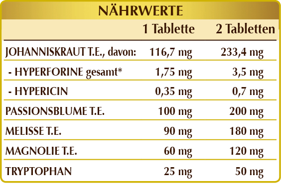 * Enthält Hyperforin und Adhyperforin (Hyperforine-Hypericin-Verhältnis = 5:1). T.E. = Trockenextrakt