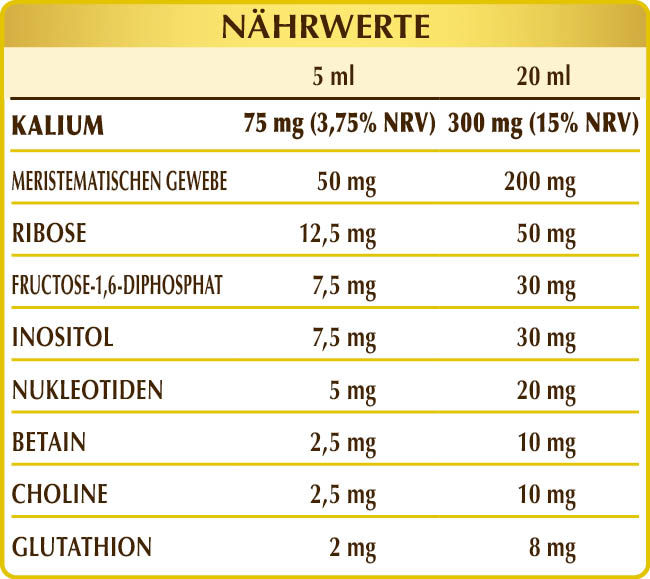 Bidestilliertes pflanzliches Glycerin, reines Wasser, Kaliumcitrat, Kaliumgluconat; Glycerinischer Macerat frischer Meristemgewebe: Mais oder Zuckerkorn (Zea mays var. Saccharata) junge Wurzeln, Esche (Fraxinus excelsior) Knospen, Kastanie (Castanea vesca oder Castanea sativa) Knospen, Weißdorn (Crataegus oxyacantha oder Crataegus monogyna) junge Triebe; Ribose, Fructose-1,6-bisphosphat; Acidität Korrektor: Citronensäure; Inositol, Betaincitrat, Cholintartrat; Nukleotid-Mischung: AMP (Adenosinmonophosphat), CMP (Cytosinmonophosphat), GMP (Guanosinmonophosphat), UMP (Uridinmonophosphat); Glutathion, Süßstoffe natürlicher Herkunft: Thaumatin.