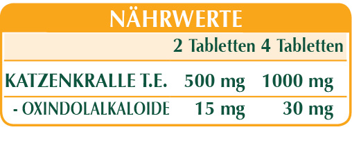 Katzenkralle (Uncaria tomentosa) Rinde T.E. (Titriert mit 3% Oxindolalkaloiden), Maltodextrine aus Mais oder Reis, mikrokristalline Cellulose°, Gummi Arabicum°, Siliciumdioxid°°, Magnesiumstearat pflanzlichen Ursprungs°°.