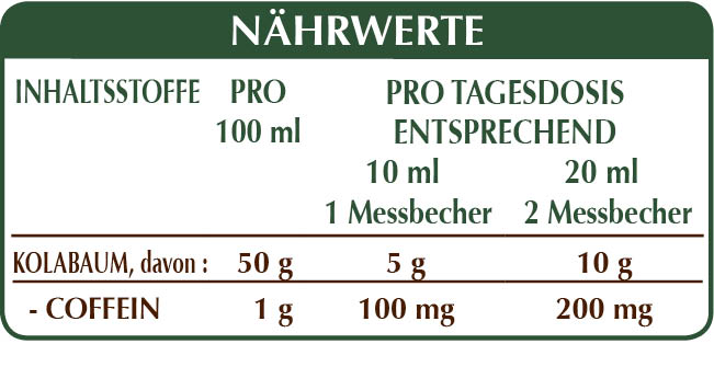 Bidestilliertes pflanzliches Glycerin, reines Wasser, Kolabaum (Cola nitida) Samen.