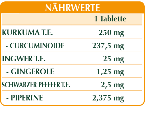 Kurkuma (Curcuma longa) Rhizome T.E. (titriert mit 95% Kurkumin), Mikrokristalline Cellulose°, Gummi Arabicum°, Maltodextrine aus Mais oder Reis, Ingwer (Zingiber officinalis) Rhizome T.E. (titriert mit 5% Gingerole), Siliciumdioxid°°, Schwarzem Pfeffer (Piper nigrum) Früchte T.E. (titriert mit 95% Piperin), Magnesiumstearat Pflanzlichen Ursprungs.°°