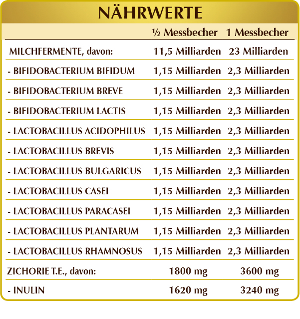 Zichorie (Cichorium Intybus) Wurzeln T.E. (standardisiert auf 90% Inulin), Maltodextrine aus Mais oder Reis, lebende Milchfermente-Mischung (standardisiert auf 10% jeder der folgenden Stämme: Bifidobacterium bifidum SD5215, breve SD5206, lactis SD5219; Lactobacillus acidophilus SD5212, brevis SD5214, bulgaricus SD5589, casei SD5213, paracasei SD5275, plantarum SD5209, rhamnosus SD5217).