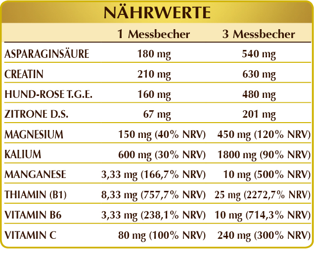 Maltodextrin aus Mais oder Reis, Kaliumcitrat, Magnesiumcitrat, Kreatinmonohydrat, Magnesiumpidolat, Magnesiumgluconat, Kaliumgluconat, (L-)Asparaginsäure, Hunds-Rose (Rosa canina) Früchte T.G.E. (standardisiert auf 50 % Vitamin C), Zitrone (Citrus limon) Früchte D.S., Zitronensäure; natürliches Aroma: Zitrone (Citrus limon) Früchtenschale Ä.Ö.; Mangangluconat, Vitamin B1 (Thiaminhydrochlorid), Vitamin B6 (Pyridoxal-5-Phosphat); Süßstoffe natürlichen Ursprungs: Steviolglykoside aus der Stevia-Planze und Thaumatin. Mit natürlichen Süßungsmitteln.