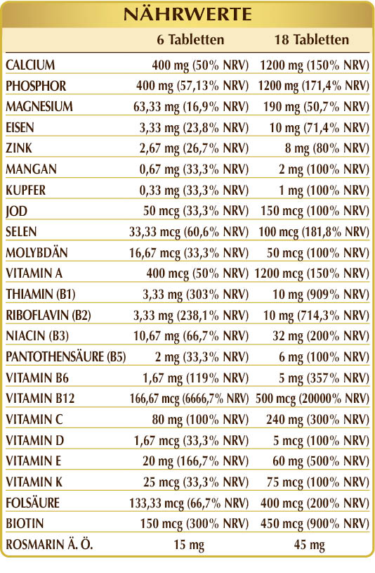 Dibasisches Calciumphosphat, Magnesiumglycerophosphat, mikrokristalline Cellulose°, Gummi arabicum°, Magnesiumstearat pflanzlichen Ursprungs°°, Vitamin C (Ascorbinsäure), Siliciumdioxid°°, Vitamin E pflanzlichen Ursprungs (D-α-Tocopherylacetat), Eisengluconat, Zinkgluconat, Rosmarin (Rosmarinus officinalis) Blütenspitzen Ä.Ö., Vitamin B3 (Inositolhexanicotinat, Nicotinamid), Mangangluconat, aktiviertes Vitamin B2 (Riboflavin-5-Natriumphosphat), Vitamin B1 (Thiaminhydrochlorid), Vitamin A (Retinylacetat), aktiviertes Vitamin B6 (Pyridoxal-5). -Phosphat), Kupfergluconat, Vitamin B5 (Calciumpantothenat), Flechte (Cladonia rangiferina) Thallus T.E. (titriert mit Vitamin D3 Cholecalcopherol 100.000 IE/g), aktiviertes Vitamin B12 (5-Desoxyadenosylcobalamin, Methicobalamin), aktivierte Folsäure (Calcium-L-Methylfolat), Natriumselenit, Kaliumiodid, Natriummolybdat, Biotin, Vitamin K1 (Phyllochinon). °Füllstoff °°Trennmittel