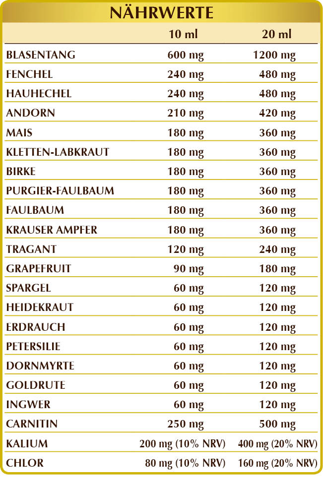 Bidestilliertes Pflanzliches Glycerin, reines Wasser, Fucus oder Blasentang (Fucus vesiculosus) Thallus (Alge) F.G.E. , Kaliumcitrat, (L-)Carnitin, Fenchel (Foeniculum vulgare) Früchte F.G.E., Hauhechel (Ononis spinosa) Wurzeln F.G.E. , Andorn (Marrubium vulgare) Kraut mit Blüten F.G.E. , Mais oder Zuckerkorn (Zea mays) Stigmata F.G.E., Kletten-Labkraut (Galium aparine) Kraut mit Blüten F.G.E. , weiße Birke(Betula alba oder pubescens) Blätter F.G.E. , Purgier-Faulbaum(Rhamnus purshiana) Rinde F.G.E., Faulbaum (Rhamnus frangula) Rinde F.G.E., Krauser Ampfer (Rumex crispus) Wurzeln F.G.E., Kaliumchlorid, Tragant (Astragalus membranaceus) Wurzeln F.G.E., Grapefruit (Citrus paradisi) Samen F.G.E., Spargel (Asparagus officinalis) Wurzeln F.G.E., Heidekraut (Calluna vulgaris) Kraut mit Blüten, Erdrauch (Fumaria officinalis) Kraut mit Blüten, Petersilie (Petroselinum crispum) Wurzeln, Dornmyrte oder Mäusedorn (Ruscus aculeatus) Wurzeln F.G.E., Goldrute (Solidago virga-aurea) Kraut mit Blüten F.G.E., Ingwer (Zingiber officinalis) Rhizome F.G.E. .
