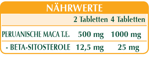 Maca oder Peruanischer Ginseng (Lepidium Meyenii) Wurzeln T.E. (titriert mit 2,5% in Beta-Sitosterolen), Maltodextrine aus Mais oder Reis, mikrokristalline Cellulose°, Gummi Arabicum°, Siliciumdioxid°°, Magnesiumstearat pflanzlichen Ursprungs°°.