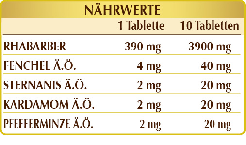 Chinesischer Rhabarber (Rheum palmatum) Rhizome, mikrokristalline Cellulose°, Gummi Arabicum°, Siliciumdioxid°°, Fenchel (Foeniculum vulgare) Früchte Ä.Ö., Sternanis (Illicium verum) Früchte Ä.Ö., Kardamom (Elettaria cardamomum) Samen Ä.Ö., Pfefferminze (Mentha piperita) Blätter Ä.Ö., Magnesiumstearat pflanzlichen Ursprungs°°.