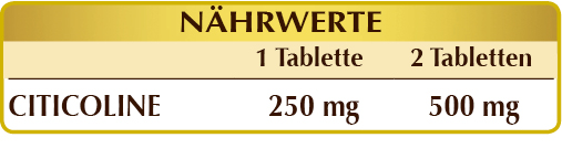 Citicolin (CDP-Cholin), mikrokristalline Cellulose°, Maltodextrine aus Mais oder Reis, dibasisches Calciumphosphat°, Gummi Arabicum°, Siliciumdioxid°°, Magnesiumstearat pflanzlichen Ursprungs°°.
