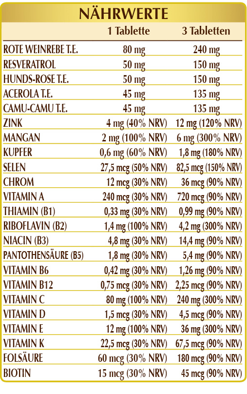 Rote Weinrebe (Vitis vinifera) Samen T.E. (titriert mit 95% oligomeren Proanthocyanidinen, Resveratrol pflanzlichen Ursprungs, Hunds-Rose (Rosa canina) Früchte T.E. (titriert mit 70% Vitamin C), mikrokristalline Cellulose°, Gummi Arabicum°, Acerola (Malpighia glabra) Früchte T.E. (titriert mit 50% Vitamin C), Camu-Camu (Myrciaria dubia) Früchte T.E. (titriert mit 50% Vitamin C), Zinkgluconat, Vitamin E natürlicher Herkunft (D-α-Tocopherylacetat), Mangangluconat, Siliciumdioxid°°, Vitamin B3 (Niacin), Magnesiumstearat pflanzlichen Ursprungs°°, Kupfersulfat, aktiviertes Vitamin B2 (Natriumriboflavin-5-phosphat), Vitamin B5 (Calcium-D-pantothenat), Vitamin A (Retinylacetat), aktiviertes Vitamin B6 (Pyridoxal-5-phosphat), Flechten (Cladonia rangiferina) Thallus D.E. (titriert in Vitamin D3 Cholecalciferol 100.000 IE/g), Vitamin B1 (Thiaminhydrochlorid), Chrompicolinat, Natriumselenit, aktiviertes Folsäure (Calcium-L-Methylfolat), Vitamin K1 (Phyllochinon), Biotin, aktiviertes Vitamin B12 (5-Deoxyadenosylcobalamin, Methylcobalamin). °Füllstoff °°Trennmittel.