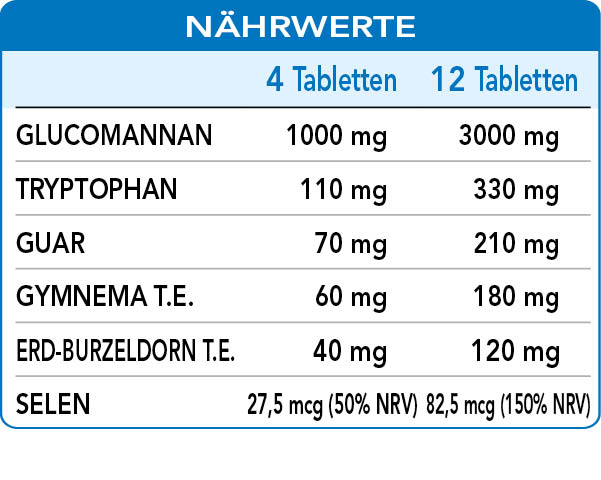 Glucomannan (Amorphophallus konjac) Wurzelpulver (90 % in Ballaststoffe), mikrokristalline Cellulose°, Arabisches Gummi°, (L-)Tryptophan, Guar (Cyamopsis tetragonoloba) Samenpulver, Gymnema (Gymnema sylvestre) Blätter T.E. (titriert mit 75% Gymnemasäure), Erd-Burzeldorn (Tribulus terrestris) Früchte T.E. (titriert mit 90% Saponine), Mais- oder Reismaltodextrin, Siliciumdioxid°, Speisegelatine°°, pflanzliches Magnesiumstearat°°, Natriumselenit.