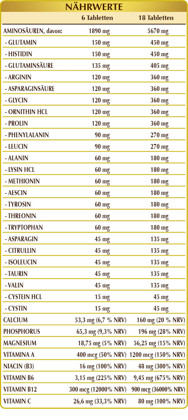 Mikrokristalline Cellulose°, dibasisches Calciumphosphat, Magnesiumglycerophosphat, Gummi Arabicum°, (L-)Glutamin, (L-)Histidin, (L-)Glutaminsäure, (L-)Arginin, (L-)Asparaginsäure, Glycin, (L-)Ornithin HCL oder Hydrochlorid, (L-)Prolin, (DL-)Phenylalanin, (L-)Leucin, Siliciumdioxid°°, (L-)Alanin, (L-)Lysin HCL oder Hydrochlorid, (L-)Methionin, (L -)Serin, (L-)Tyrosin, (L-)Threonin, (L-)Tryptophan, (L-)Asparagin, (L-)Citrullin, (L-)Isoleucin, Taurin, (L-)Valin, Magnesiumstearat pflanzlichen Ursprungs°°, Vitamin C (Ascorbinsäure), Vitamin B3 (Inositolhexanicotinat, Nicotinamid), (L-)Cystein HCL oder Hydrochlorid, (L-)Cystin, aktiviertes Vitamin B6 (Pyridoxal-5-phosphat), Vitamin A (Retinylacetat), aktiviertes Vitamin B12 (5-Desoxyadenosylcobalamin, Methylcobalamin).