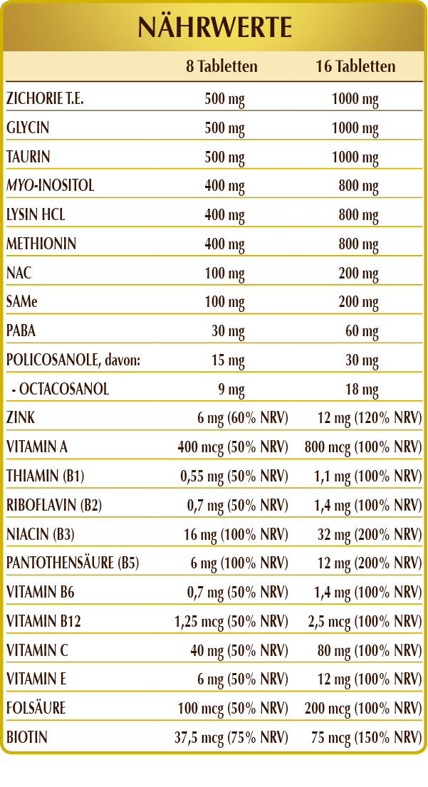 Zichorie (Cichorium Intybus) Wurzeln T.E. (titriert mit 90% Inulin), Glycin, Taurin, Inositol, (L-)Lysin, (L-)Methionin, mikrokristalline Cellulose°, Gummi Arabicum°, NAC (N-Acetylcystein), SAMe (S-Adenosylmethionin), Siliciumdioxid°°, Zinkgluconat, Vitamin C (Ascorbinsäure), PABA (p-Aminobenzoesäure), Magnesiumstearat pflanzlichen Ursprungs°°, Vitamin B3 (Nicotinamid), Policosanole aus Zuckerrohr (Extrakt standardisiert auf 60% Octacosanol), Vitamin E natürlicher Herkunft (D-α-Tocopherylacetat), Vitamin B5 (Calciumpantothenat), Vitamin A (Retinylacetat), Vitamin B6 (Pyridoxin), Vitamin B2 (Riboflavin), Vitamin B1 (Thiamin), Folsäure, Biotin, Vitamin B12 (Cyanocobalamin). °Füllstoff. °°Trennmittel