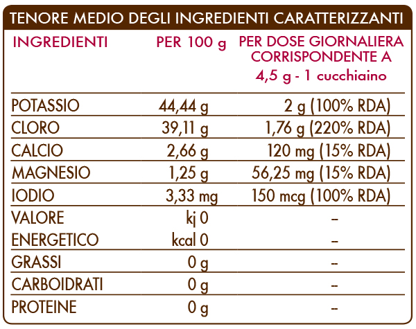Nahrungsergänzungsmittel reich an Mineralstoffen. Kalium trägt zur Aufrechterhaltung eines normalen Blutdrucks bei, fördert die Muskelfunktion und unterstützt, zusammen mit Jod und Magnesium, die Funktionalität des Nervensystems.