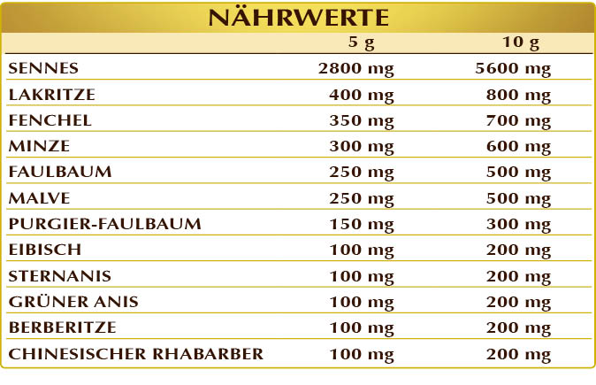 Gemisch aus geschnittenen Kräutern: Sennes (Cassia angustifolia) Blätter und Früchte (Follikel), Fenchel (Foeniculum vulgare) Früchte, Pfefferminze (Mentha piperita) Blätter, Lakritze (Glycyrrhiza glabra) Wurzeln, Faulbaum (Rhamnus frangula) Rinde, Malve (Malva sylvestris) Blüten und Blätter, Purgier-Faulbaum (Rhamnus purshiana) Rinde, Eibisch (Althaea officinalis) Wurzeln, Sternanis (Illicium verum) Früchte, grüner Anis (Pimpinella anisum) Früchte, Berberitze (Berberis vulgaris) Wurzelrinde, chinesischer Rhabarber (Rheum palmatum) Rhizome.
