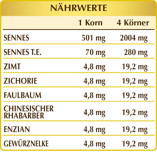 Sennes, Zichorie, Faulbaum und Rhabarber fördern die regelmäßige Darmpassage. Zimt, Nelken und Enzian tragen zur Beseitigung von Darmgasen bei und fördern die Verdauungsfunktion.