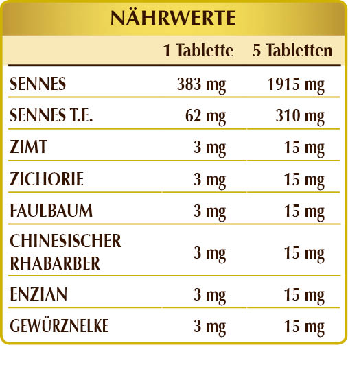Sennes (Cassia angustifolia) Blätter Pulv., Sennes (Cassia angustifolia) Blätter T.E., Gummi Arabicum°, mikrokristalline Cellulose°, Siliciumdioxid°°, Zimt (Cinnamomum zeylanicum) Rinde Pulv., Zichorie (Cichorium intybus) Wurzeln Pulv., Faulbaum (Rhamnus frangula) Rinde Pulv., chinesischer Rhabarber (Rheum palmatum) Rhizome Pulv., Enzian (Gentiana lutea) Wurzeln Pulv., Gewürznelke (Eugenia caryophyllata) Blütenknospen Pulv., Magnesiumstearat pflanzlichen Ursprungs°°. Pulv. = Pulver