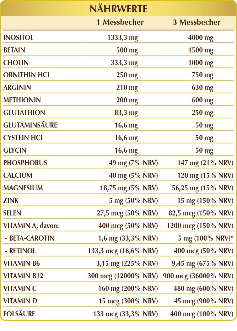 Pflanzliches Myo-Inositol (Maiskernextrakt), Maltodextrin aus Mais oder Reis, Cholintartrat, Betainbase, (L-)Ornithinhydrochlorid oder -hydrochlorid, Calciumglycerophosphat, (L-)Arginin, (L-)Methionin, Magnesiumglycerophosphat, Vitamin C (Ascorbinsäure), reduziertes Glutathion, Zinkgluconat, (L-)Glutaminsäure, (L-)Cysteinhydrochlorid oder -hydrochlorid, Glycin, Dunaliella (Dunaliella salina) Thallus (Alge) T.E. (standardisiert auf 10 % Beta-Carotin), aktiviertes Vitamin B6 (Pyridoxal-5-phosphat), natürliche Süßstoffe: Steviolglycoside aus Stevia und Thaumatin; Flechten (Cladonia rangiferina) Thallus T.E. (standardisiert auf Vitamin D3 Cholecalciferol 100.000 IE/g), Vitamin A (Retinylacetat), aktiviertes Vitamin B12 (5-Desoxyadenosylcobalamin, Methylcobalamin), aktivierte Folsäure (Calcium-L-Methylfolat), Natriumselenit, Vitamin D2 (Ergocalciferol) pflanzlichen Ursprungs (aus Zuckerrohr gewonnen).