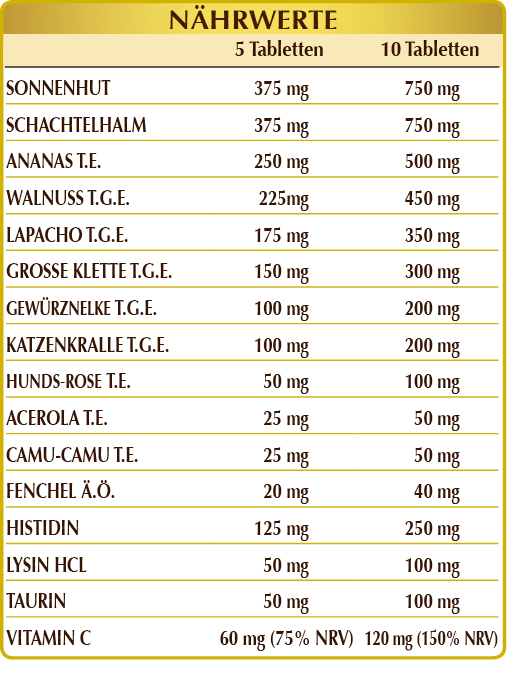 Nahrungsergänzungsmittel auf Grundlage von Kräutern, Aminosäuren und Vitamin C. Sonnenhut, Lapacho und Katzenkralle fördern die natürlichen Abwehrkräfte des Körpers. Vitamin C, das natürlich in der Hunds-Rose, der Acerola und der Camu-Camu vorkommt, trägt zur normalen Funktion des Immunsystems bei. Walnuss, Große Klette und Lapacho unterstützen die Reinigungsfunktionen des Körpers, während Schachtelhalm, Ananas und Fenchel die Drainage der Körperflüssigkeiten fördern.
