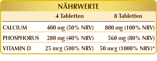 Calcium, Phosphor und Vitamin D sind vor allem nützlich, um die normale Aufrechterhaltung der Knochen und Zähne zu fördern. Vitamin D unterstützt die Absorption und die Verwendung von Calcium und Phosphor und leistet bei der normalen Funktion des Immunsystems Mithilfe; zusammen mit Calcium, trägt es zur Aufrechterhaltung der Muskelfunktion bei und greift in die Prozesse der Zellteilung ein. Calcium trägt des Weiteren zur normalen Neurotransmission und Blutgerinnung bei und erhält, zusammen mit Phosphor, den Energiestoffwechsel aufrecht.