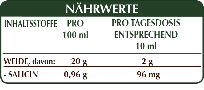 Alkoholfreie Flüssig Gesamt-Extrakt, gewonnen aus: bidestilliertes pflanzliches Glycerin, reinem Wasser, Weide (Salix alba und purpurea) Wurzel.