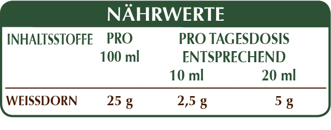 Alkoholfreie Flüssig Gesamt-Extrakt, gewonnen aus: bidestilliertes pflanzliches Glycerin, reinem Wasser, Weißdorn (Crataegus oxyacantha) Blüten und Blätter.