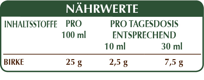 Alkoholfreie Flüssig Gesamt-Extrakt, gewonnen aus: bidestilliertes pflanzliches Glycerin, reinem Wasser, Birke (Betula alba oder pubescens) Blätter.