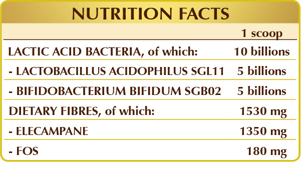 Chicory root inulin, corn or rice-derived maltodextrins, FOS (fructo-oligosaccharides), lactic acid bacteria (Lactobacillus acidophilus SGL11 and Bifidobacterium bifidum SGB02).