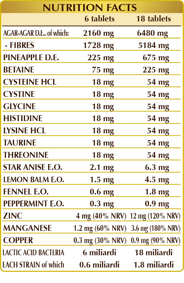 Agar-agar is a soluble fibre that cannot be digested nor absorbed by the gut; it normalises stool volume and consistency, supporting regular bowel movements. Probiotic lactic acid bacteria are useful in rebalancing intestinal flora. Enriched with amino acids, essential oils, minerals and other nutrients.