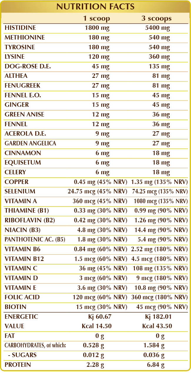 (L-)histidine, corn or rice-based maltodextrins, (L-)methionine, (L-)tyrosine, (L-)lysine HCL or hydrochloride, dog-rose (Rosa canina) fruit D.E. (standardized 70% vitamin C), marshmallow (Althaea officinalis) root Pulv, fenugreek (Trigonella foenum-graecum) seed Pulv, fennel (Foeniculum vulgare) fruit E.O., dill (Anethum graveolens) fruit Pulv, green anise (Pimpinella anisum) fruit Pulv, fennel (Foeniculum vulgare) fruit Pulv, ginger (Zingiber officinalis) rhizome Pulv, plant-derived vitamin E (D--tocopheryl acetate), acerola (Malpighia glabra) fruit D.E. (standardized to 50% in vitamin C), plant-derived vitamin E (D-α-tocopheryl acetate); natural origin sweeteners: steviol glycosides from stevia, thaumatin; garden angelica (Angelica archangelica) root Pulv., cinnamon (Cinnamomum zeylanicum) bark powder, horsetail (Equisetum arvense) herb powder, vitamin B3 (nicotinamide), vitamin A (retinyl acetate), copper sulfate, vitamin B5 (calcium pantothenate), activated vitamin B6 (pyridoxal-5-phosphate), vitamin D3 (cholecalciferol 100,000 IU/g), activated vitamin B2 (riboflavin 5’-phosphate sodium), vitamin B1 (thiamine hydrochloride), activated folic acid (L-methylfolate calcium), sodium selenite, biotin, activated vitamin B12 (5-deoxyadenosylcobalamin, methylcobalamin). Pulv. = Powder Sweetened only with natural sweeteners.