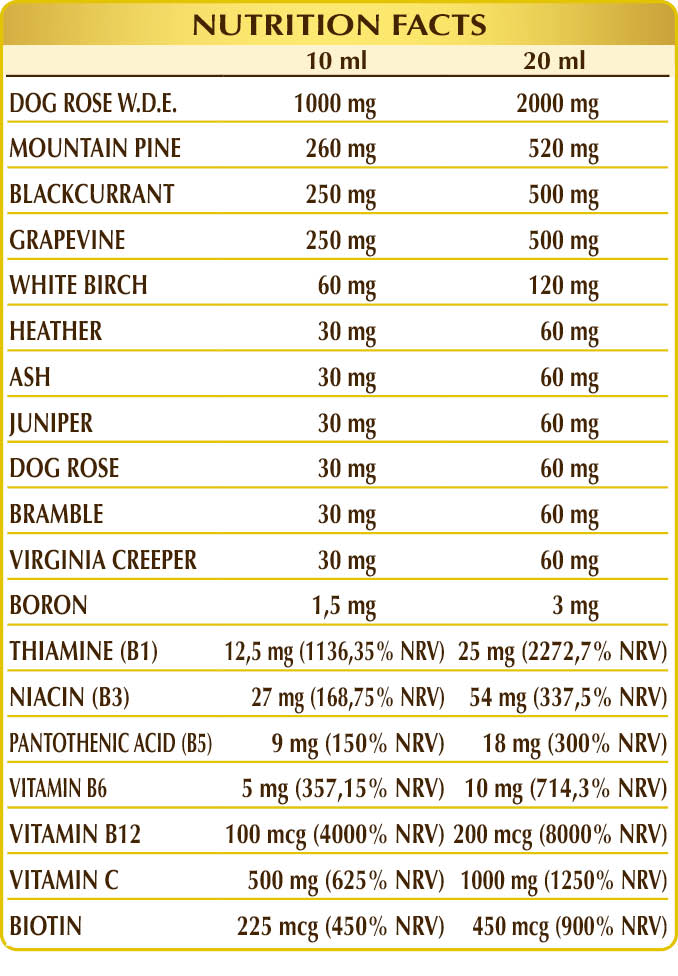 Food supplement made from glycerine macerate of fresh meristematic tissues, high in vitamins that all contribute to normal energy metabolism. In particular, vitamins B6, B12, and C support normal function of the immune system, and, along with vitamins B3 and B5, reduce tiredness and fatigue. Vitamin C protects cells from oxidative stress and promotes collagen formation, helping to maintain the normal functions of blood vessels, bones, cartilage, skin, teeth, and gums. Furthermore, biotin contributes to maintaining hair health.